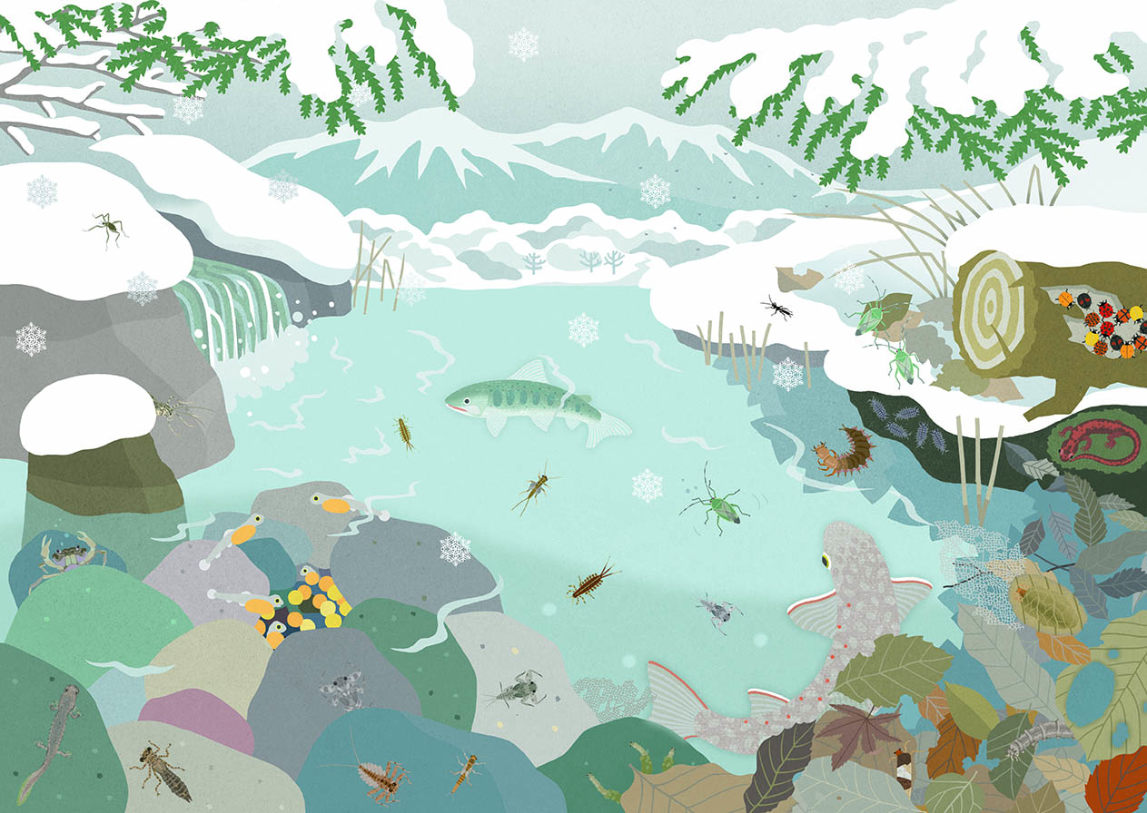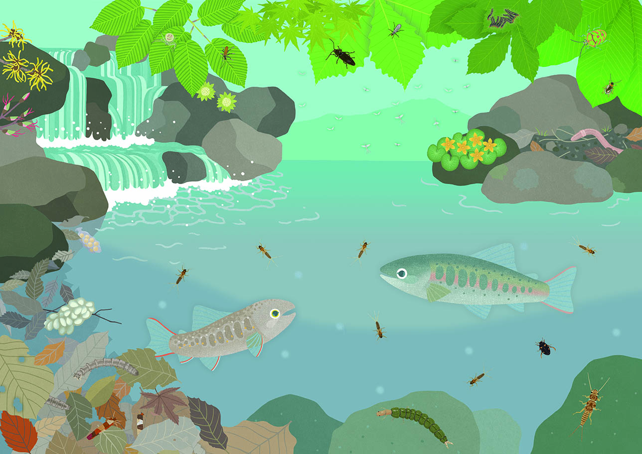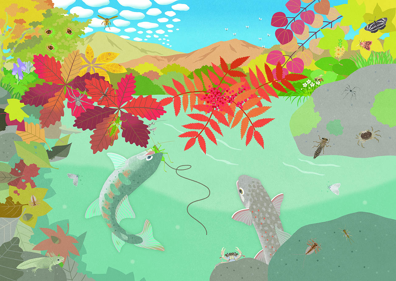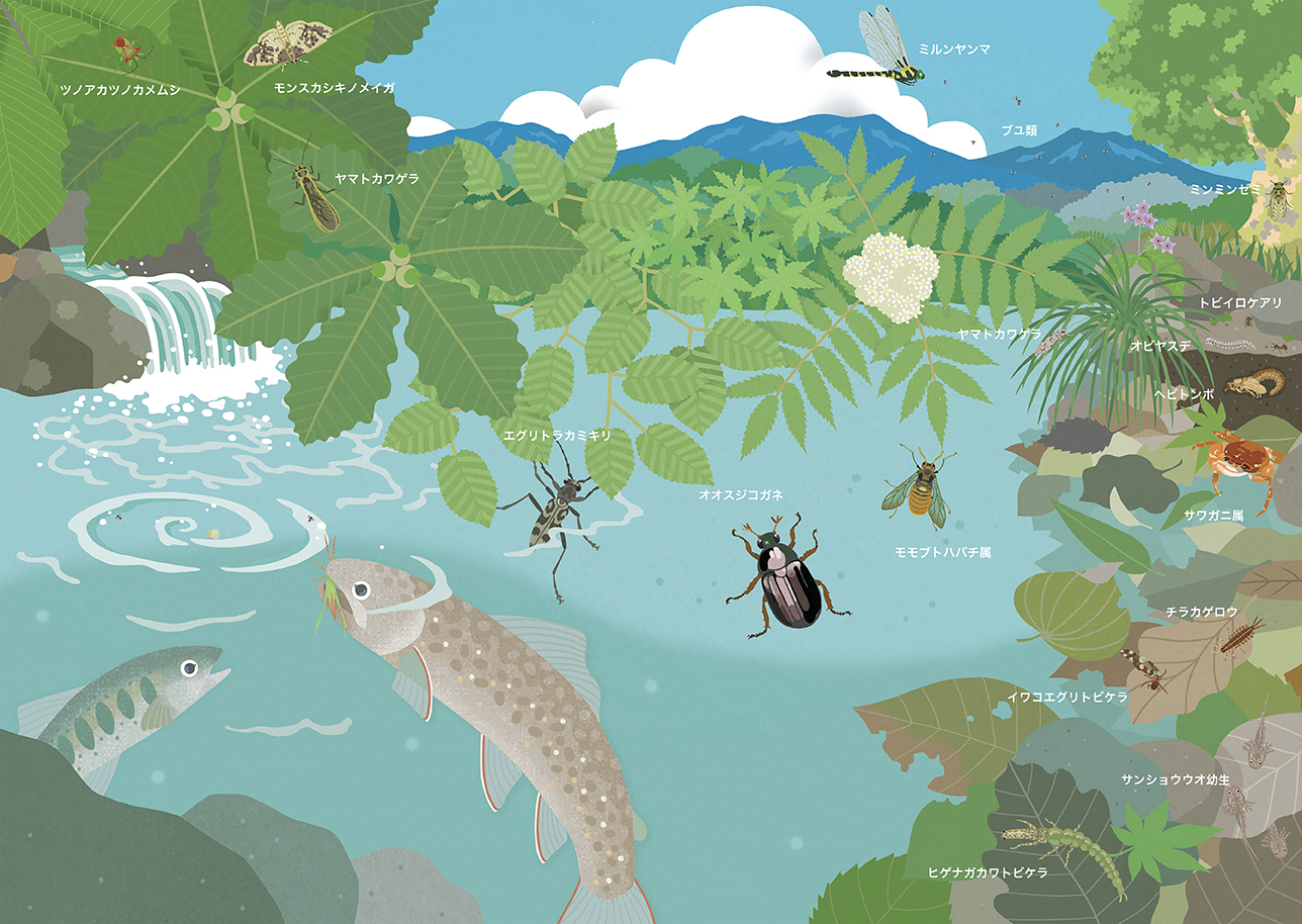 いわな/昆虫イラスト/ムシイラスト/川と森の生き物/生物イラスト/魚イラスト/魚絵本/虫絵本/生き物/絵本/あさりまゆみ/生物/昆虫/環境/イラストレーション/ネイチャー/エコ/児童絵本